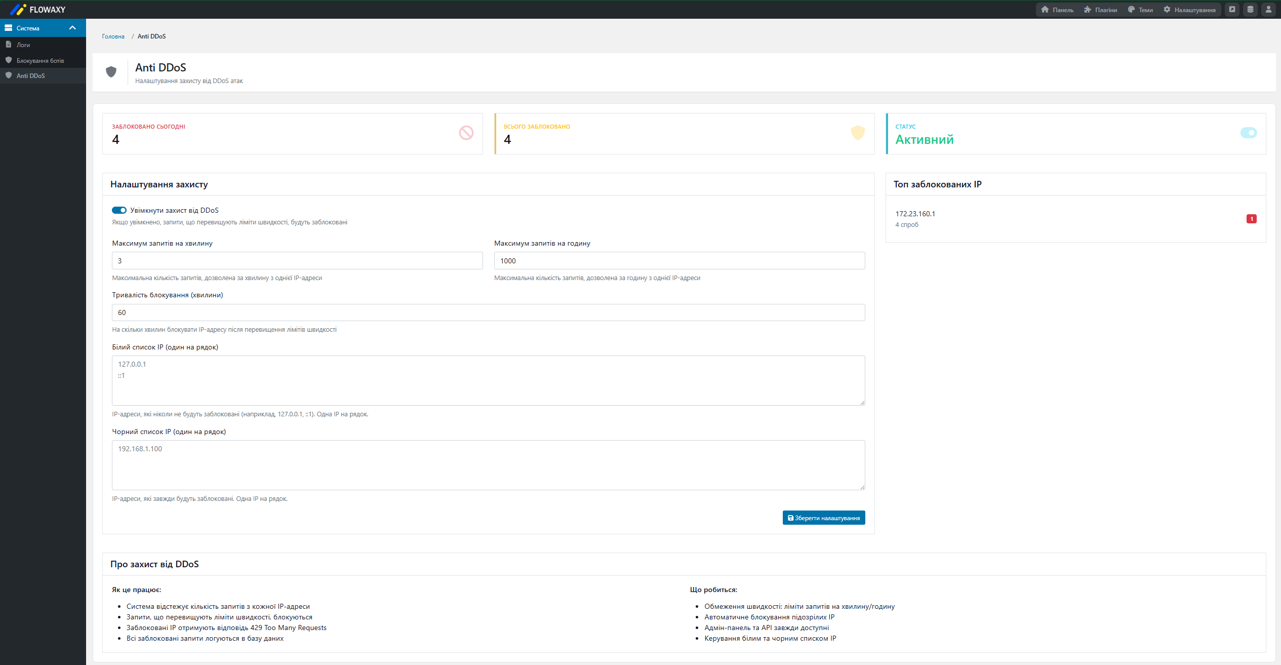 Описание: Плагин Anti DDoS для Flowaxy CMS обеспечивает защиту от DDoS-атак (Distributed Denial of Service), ограничивая количество запросов с IP-адресов и блокируя подозрительную активность. Плагин отслеживает частоту запросов и автоматически блокирует IP-адреса, превышающие установленные ограничения.