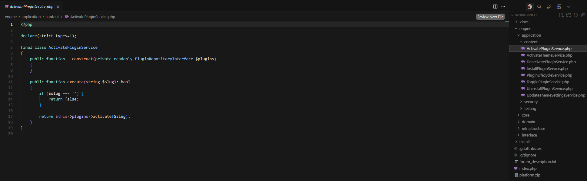 єто модульный PHP-движок с современной архитектурой, поддержкой плагинов, тем и системой хуков. Движок построен на принципах чистой архитектуры с разделением на слои: ядро, домен, инфраструктура и интерфейс.