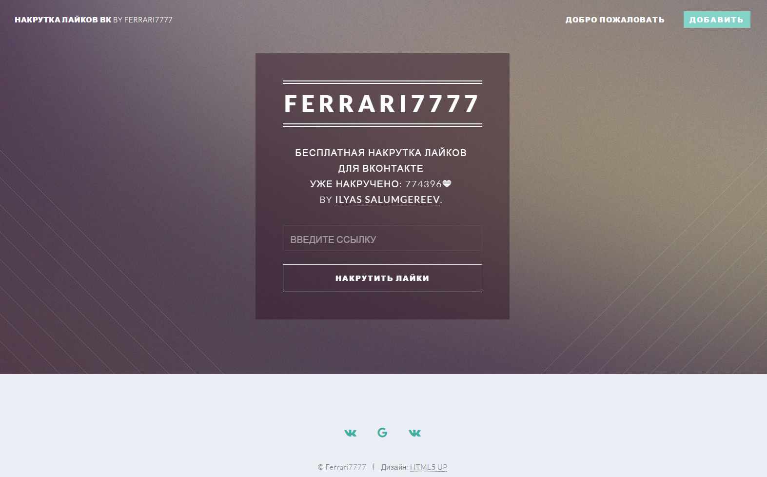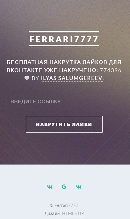 Нашел в просторах шаблон, решил использовать для сайта накрутки) ждите скоро скину ссылку) будет крутить 200-500 лайков на фото :D главное теперь наломать страницы школьников, в вк, попросил 3-4-х друзей заняться этим, думаю за пару дней наломают аккаунтов 200-300 хотя бы) оцениваем по 10 бальной шкале