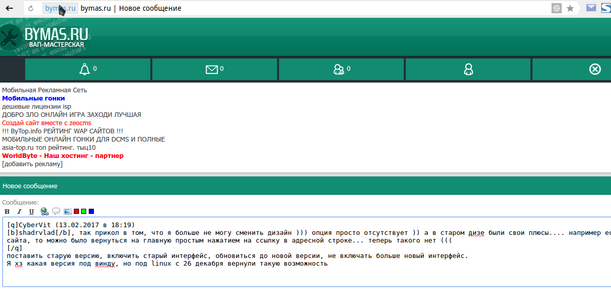 CyberVit (13.02.2017 в 18:19) shadrvlad , так прикол в том, что я больше не могу сменить дизайн ))) опция просто отсутствует )) а в старом дизе были свои плюсы.... например если залез в дебри сайта, то можно было вернуться на главную простым нажатием на ссылку в адресной строке... теперь такого нет (((