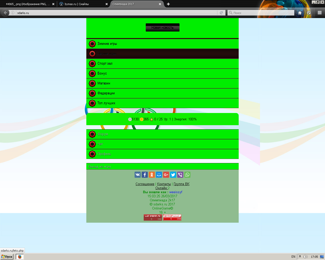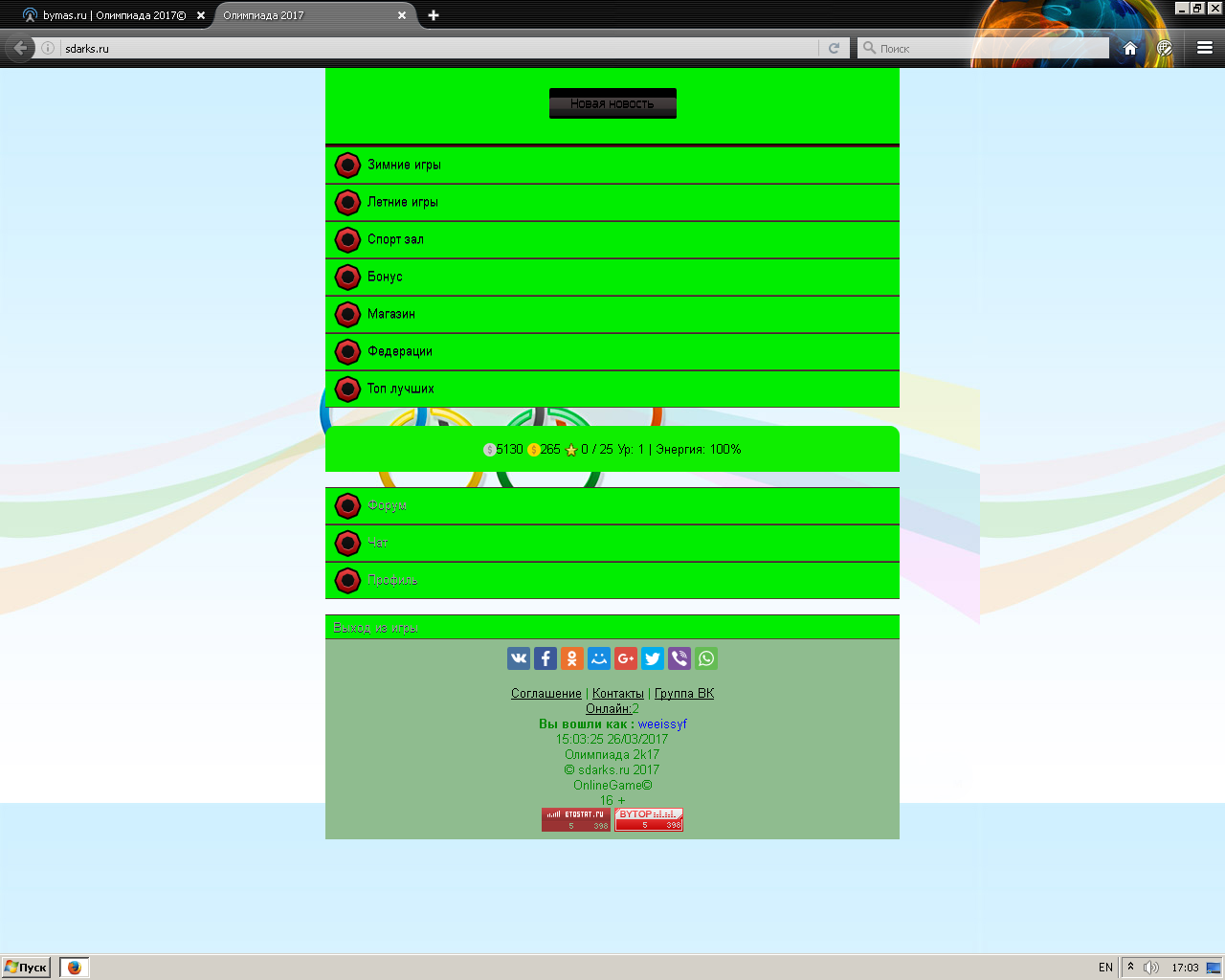 Всем привет, многие знают что я запустил онлайн игру "Олимпиада 2017" Знаю "переделка" но она стала сильно отличаться от той игры. и это не конец. Я не собираюсь на этом остонавливатся, и придумываю новые идеи для игры. А так же приглашаю вас дорогие коллеги пойграть в игру. Это не колхоз который уже по всему инету расспространился, не марс который тоже уже по всюду. а это отличная игра и называеться "Олимпиада 2017". В общем жду вас в гостях;)