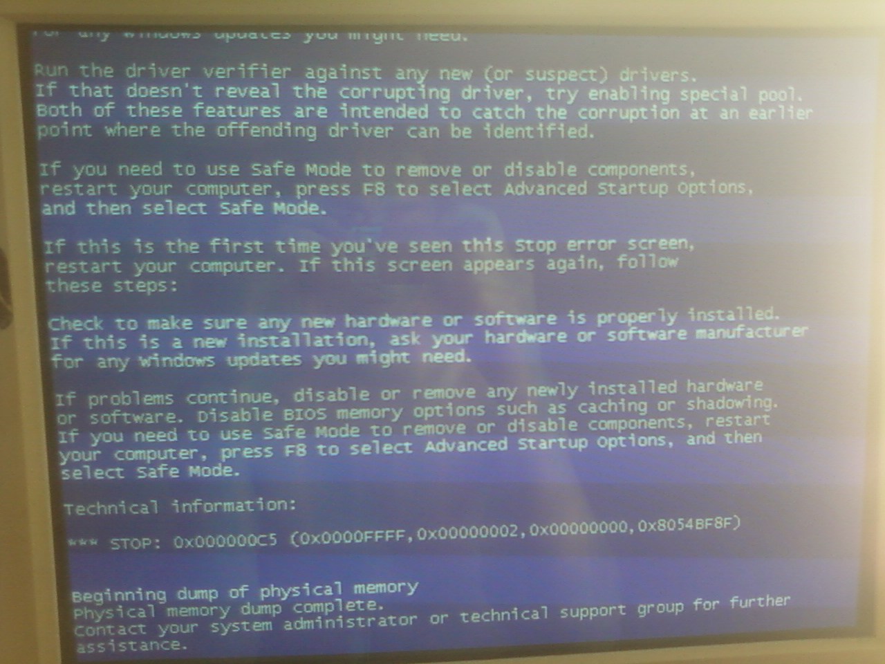 вот это вылетает не понятно из за чего думал что жёсткому хана в итоге нет теперь думаю что видюхе жопа типо она перегривается кароче ребята кто шарит в ПК помогите, гуглил не чего нормального не нашёл надежда на вас осталась код ошибк STOP: 0x000000C5 (0x0000FFFF, 0x00000002, 0x00000000, 8054BF8F)
