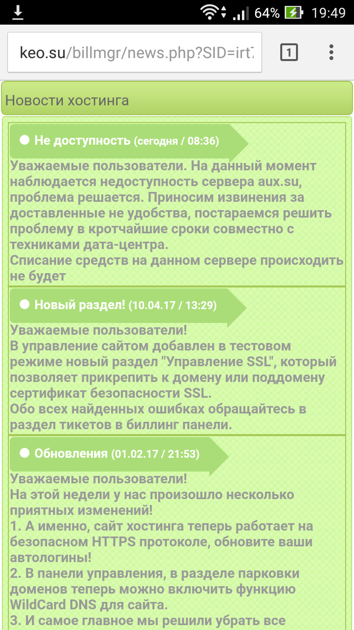 Администрация кео работает с SSL сертефикатами, вот и вырубается вечно, я с тех под говорил, еще месяц - два пострадаете