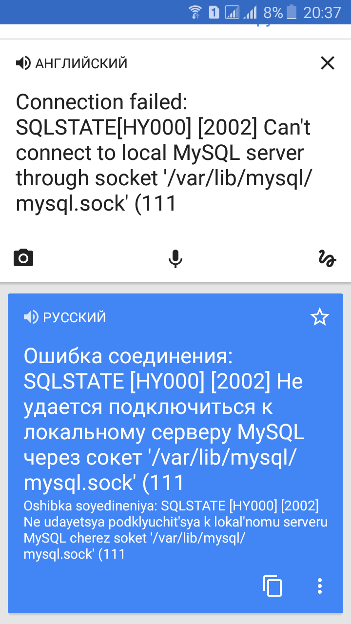 [T]rec80 (03.08.2017 в 20:32) Что значит сие чудо?? Гугл не дал решения.. Connection failed: SQLSTATE[HY000] [2002] Can't connect to local MySQL server through socket '/var/lib/mysql/mysql.sock' (111