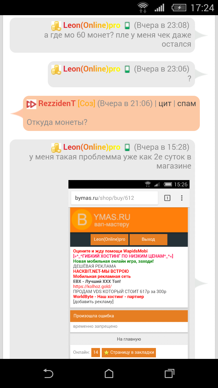Leon(Online)pro , жду скрин переписки с админом и доказательства снятия монет со счета. иначе это можно расценивать как клевету и попытку ввести администрацию в заблуждение