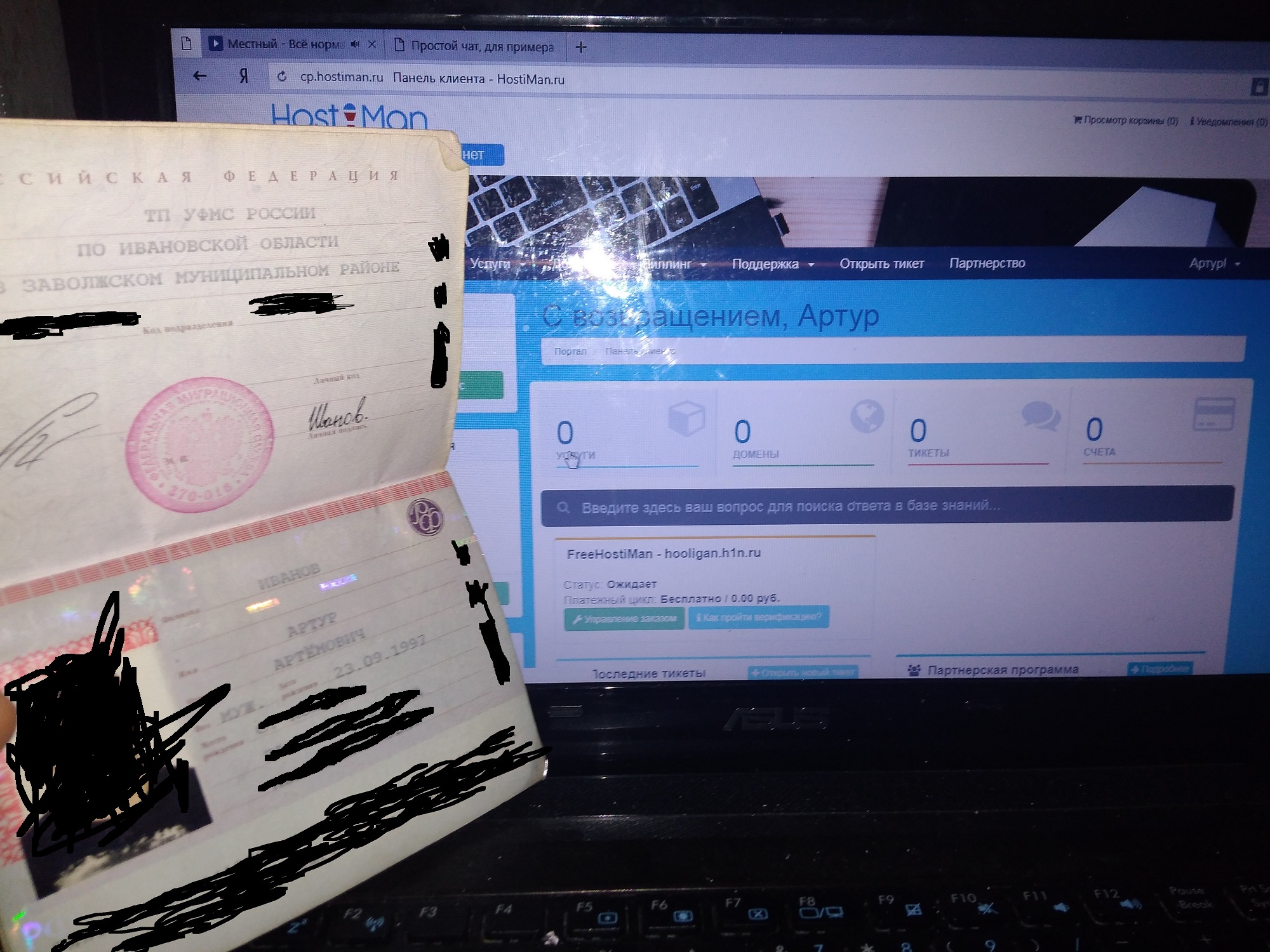 При регистрации бесплатного хостинга нужно обратиться в ТП, то есть для начала создать заказ, а после обратиться в ТП. Вам придется предоставить фото с главным разворотом паспорта на фоне сайта, им не нужны все ваши паспортные данные, только ФИО, все остальное можно закрасить. Далее зададут вопрос, как будите использовать выделенное место. Нужно вступить в группу вконтакте и сделать репост на стену. Все бесплатный хостинг у вас в руках)
