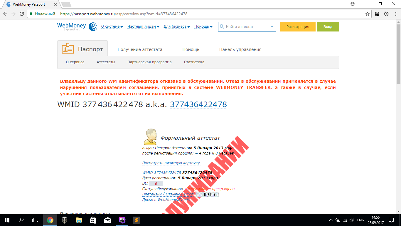 Тебе отказано в обслуживании на сервисе WebMoney, у тебя не может быть кошелька на этом сервисе НИКОГДА, поэтому, если он у тебя есть, то он ЛЕВЫЙ, то есть ты пользуешься сервисом WebMoney мошенническим способом, то есть путём обмана, используя чужой WMID либо чужие данные.