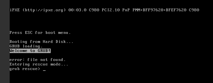 А вот операционная система, которую устанавливаете, настраиваете и администрируете вы имеет проблемы с загрузкой. А именно, grub не может по какой-то причине найти загрузочную запись на диске что бы загрузить ОС.