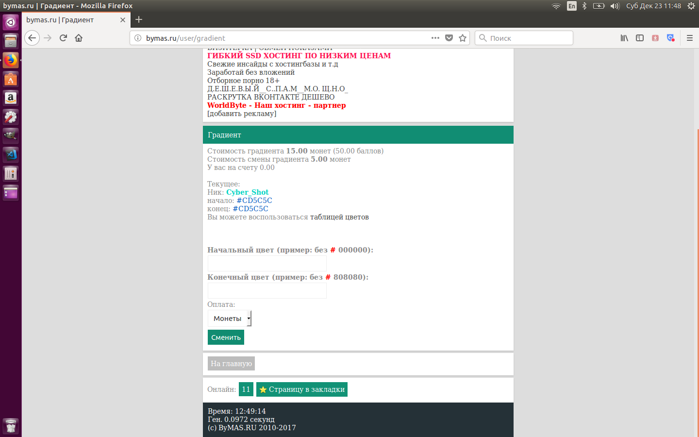 Veteran , и кстати надо написать что смена цвета стоит 25баллов(если не первый раз). Ибо я на 50 рассчитывал, а сняло 25