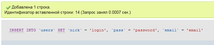 $db->query("INSERT INTO `users` SET `login` = '".$login."', `password` = '".$password."', `email` = '".$email."'");