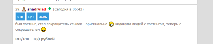 5. Каждому юзеру форума запрещено писать сообщения, которые не имеют как такового смысла (флуд, оффтоп, спам). (Блокировка на 12 ч.)