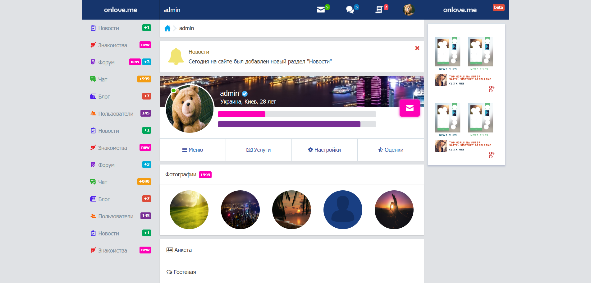 Длительное время занимаюсь разработкой своей социальной сети, но раньше как-то не шло, не было время и т.д. А вот последние две недели начал основательно ею заниматься. Всё написано с нуля. Дизайн адаптивный