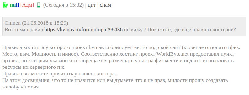 2.3 Придумывает правила на ходу , сначало говорил о правилах bymas, затем сказал что правил на Bymas таких нет, но есть у worldbyte(не предоставил не скринов не ссылку) , а так же отказывался предоставить скрин или ссылку на правила, которые я нарушил.