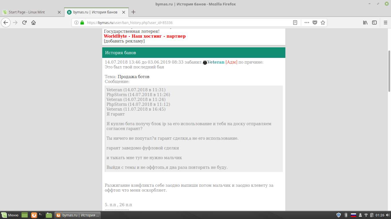 Только что вышел из какого-то та бана, но его нет в истории банов, вот последний