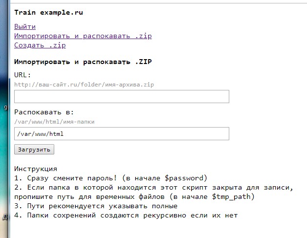 Train | Транспорт между серверами Создан для переноса папки с одного сервера на другой, без скачивания на компьютер 1. Входим по паролю (указывается в скрипте, по умолчанию "12345") 2. Создаём zip архив папки которую собираемся переносить 3. Переходим ко второму сайту, на который установлен аналогичный скрипт 4. Скачиваем и распаковываем архив Скачать из Bymas ЗЦ .