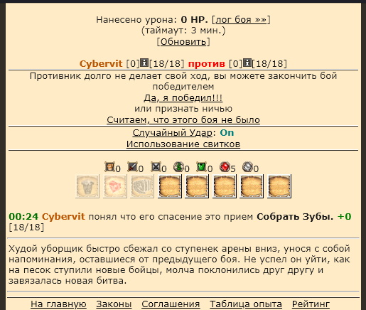 на ход дается 3, 5 или 10 мин(выставляется в начале боя), если допустим соперник не ударил - то есть возможность выбрать победу