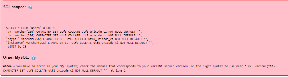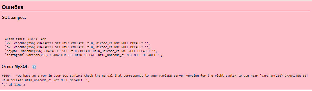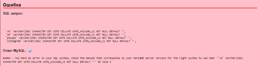 `instagram` varchar(256) CHARACTER SET utf8 COLLATE utf8_unicode_ci NOT NULL DEFAULT '', То ошибка
