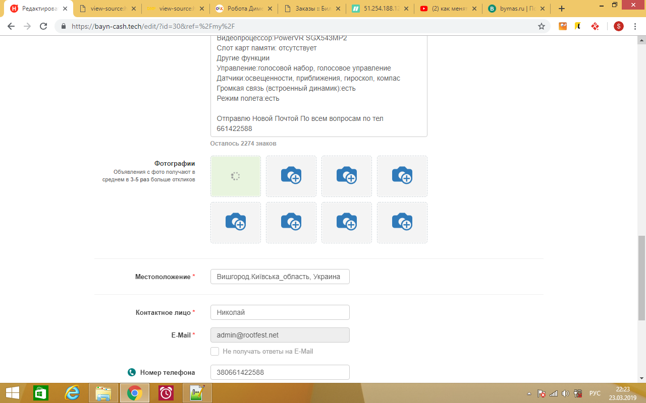 У меня на сайте ,такая ерунда когда добавляеш в обявления фотку оно грузитса но не добавляется.Помогите пожалуста.https://bayn-cash.tech/