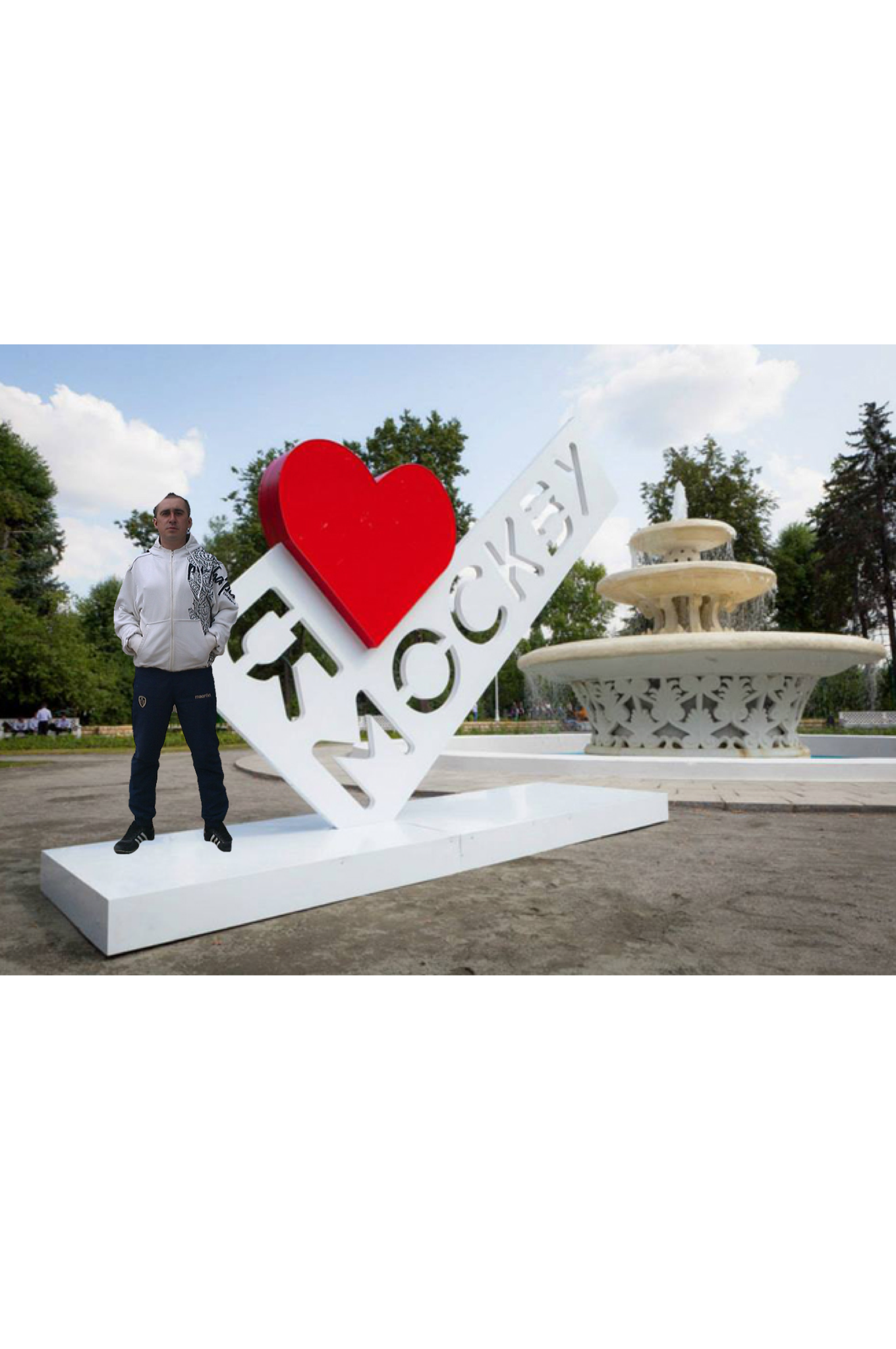 Ну вырезать человека с фото и сменить фон со стеллой "Я люблю Москву"