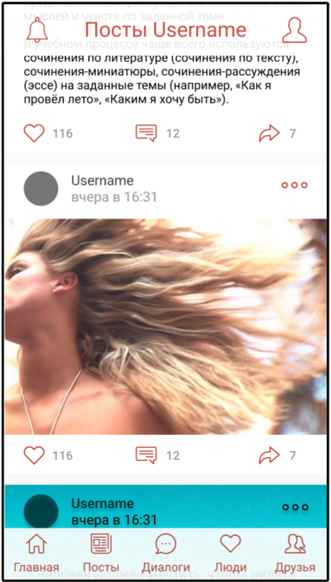 Один из экранов. Шапка точно будет полупрозрачной, над таббаром пока в раздумьях. Всего у пользователя будет 3 вида контентных публикаций (не считая групп), это — один из основных разделов на сайте.