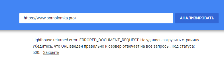 Lighthouse returned error: ERRORED_DOCUMENT_REQUEST. Не удалось загрузить страницу. Убедитесь, что URL введен правильно и сервер отвечает на все запросы. Код статуса: 500. гугл девелопер так пишеть что это значить как исправить?