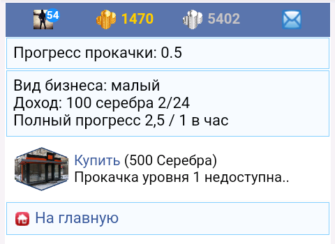 При достижении рейтинга 5.0 появляется возможность напасть на бизнес другого обитателя. Стоимость для того чтобы напасть 100 монет. Нападать можно один раз в сутки на одного обитателя. Серебро для покупки 1 вашего бизнеса можно заработать на главной зарабатываем баллы.
