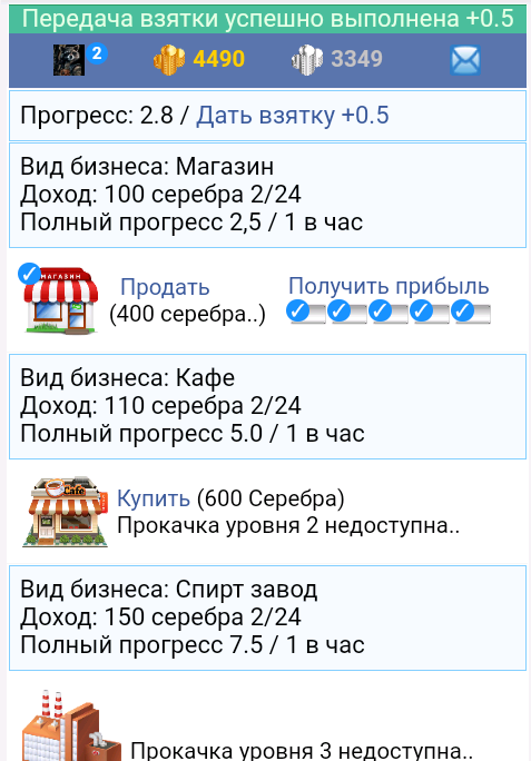 Суть игры нужно покупать бизнес и прокачивать его . В каждом уровне пять подуровней. Прокачка подуровня доступно каждый час . За каждую прокачку даётся 0.1% игрового рейтинга.