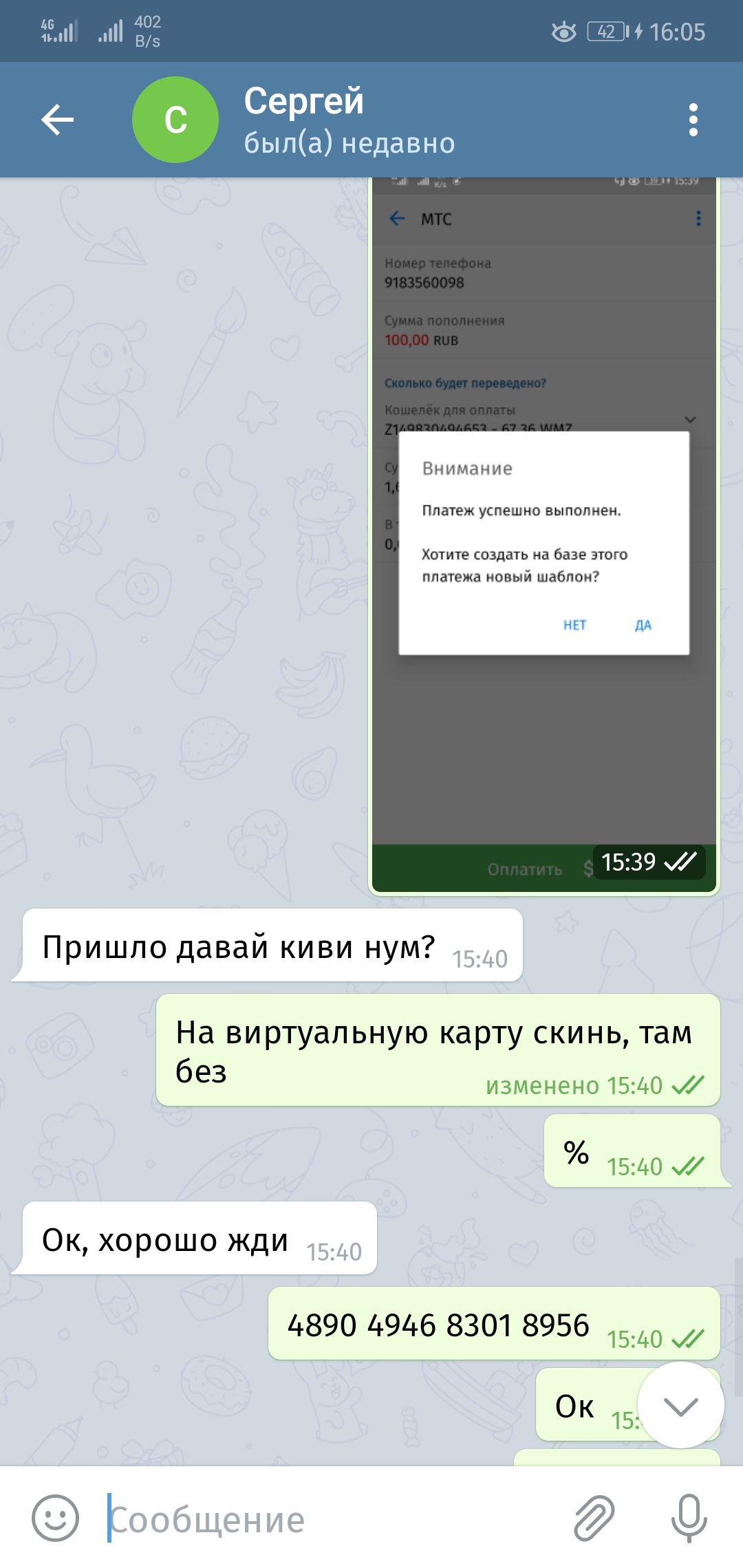 Потом, через 20минут он попросил помочь, скинуть ему 100р на номер, а он мне на киви, обмен мне не нужен был вообще, но решил ему помочь, сказал, мол у него номер заблокирован и что он не может первым скинуть, понятно стало, что он едрить. Но всё таки скинул ему сотку, сумма то небольшая, не кинет, так и думал я, но чел слился просто. Не стал ему звонить на этот номер, в тг не брал. Просить вернуть сотку пр телефону 8 летнему мальчику очень низко, пусть себе смузи купить, мозг попробует развивать Гг