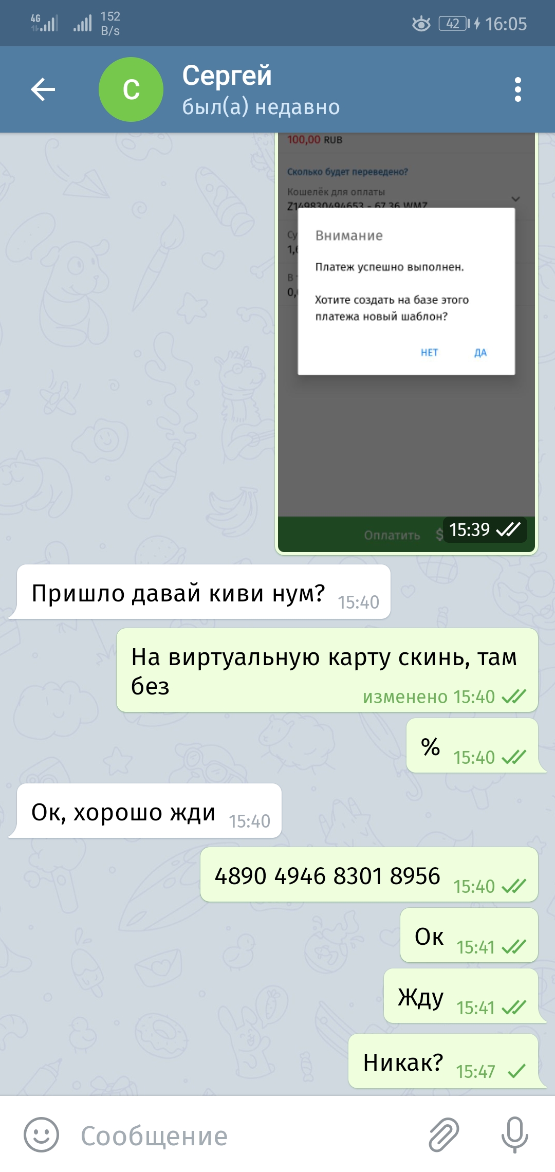 Потом, через 20минут он попросил помочь, скинуть ему 100р на номер, а он мне на киви, обмен мне не нужен был вообще, но решил ему помочь, сказал, мол у него номер заблокирован и что он не может первым скинуть, понятно стало, что он едрить. Но всё таки скинул ему сотку, сумма то небольшая, не кинет, так и думал я, но чел слился просто. Не стал ему звонить на этот номер, в тг не брал. Просить вернуть сотку пр телефону 8 летнему мальчику очень низко, пусть себе смузи купить, мозг попробует развивать