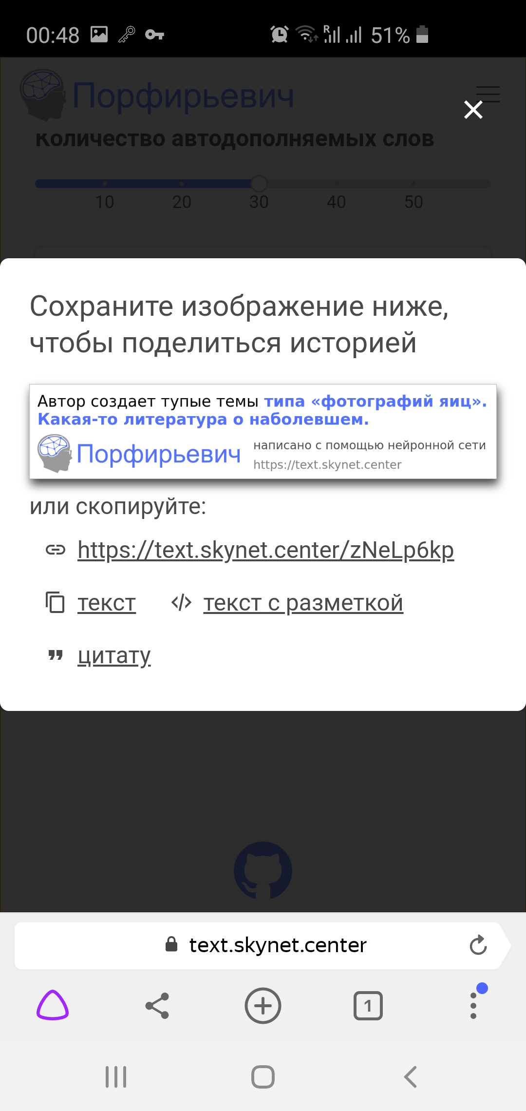 • Установить количество слов (от 1 до 60), которые будут дополнены алгоритмом к Вашей изначальной истории.