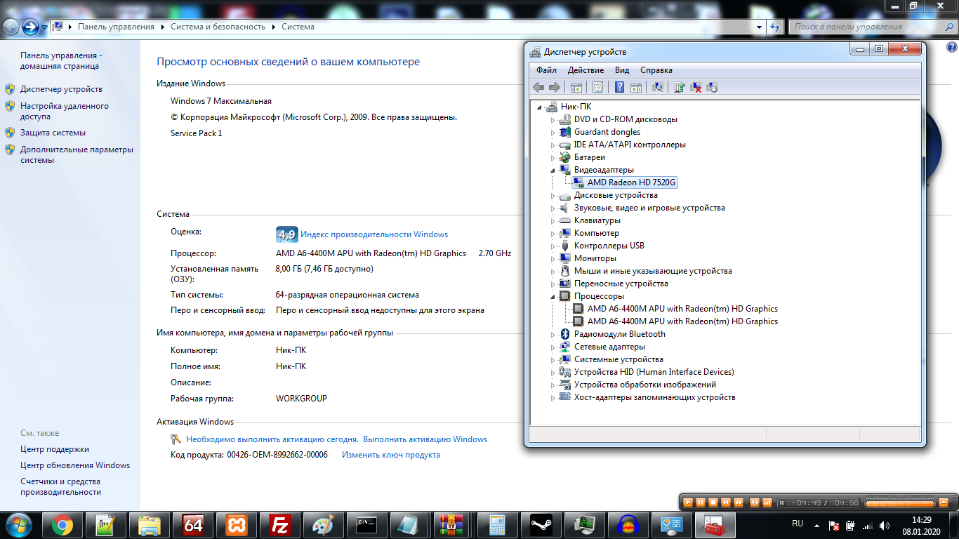 Процессор: AMD A6-4400M APU with Radeon(tm) HD Graphics (2 ядра по 2,7ггц)