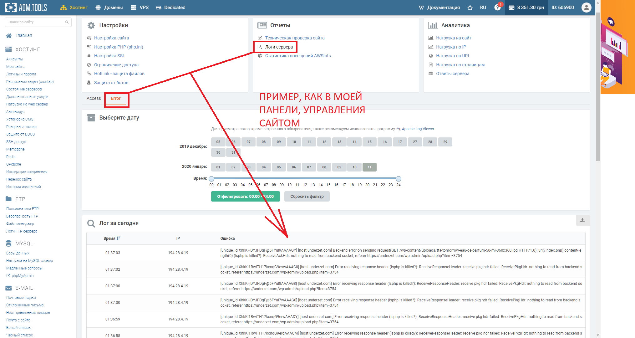 В панели... Управления хостинга.