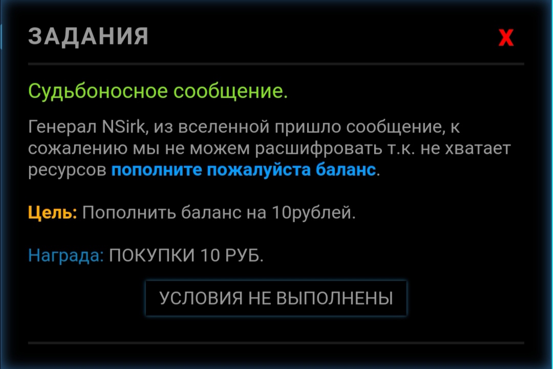 <br><br><span class="res-3">Цель:</span> Пополнить баланс на 10рублей. <br><br><span class="res-2">Награда:</span> ПОКУПКИ 10 РУБ. <? if($data['pay_money_all'] == 10){?> <div class="side-bar-title-btn"> <input id="q_line6" type="button" onclick="quest_line(6)" value="ЗАБРАТЬ НАГРАДУ!"> </div> <?}else{?> <div class="side-bar-title-btn"> <br><span>УСЛОВИЯ НЕ ВЫПОЛНЕНЫ</span> И скрин что выдает на сайте