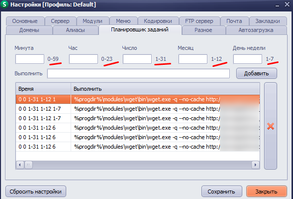 Пример запланированного задания (запрос файла cron.php по HTTP и сохранение ответа во временный файл чтобы не скапливался мусор):[hljs class="php"]%progdir%moduleswgetbinwget.exe -q --no-cache http://site/путь к файлу/имя файла.php -O %progdir%userdatatemptemp.txt[/hljs