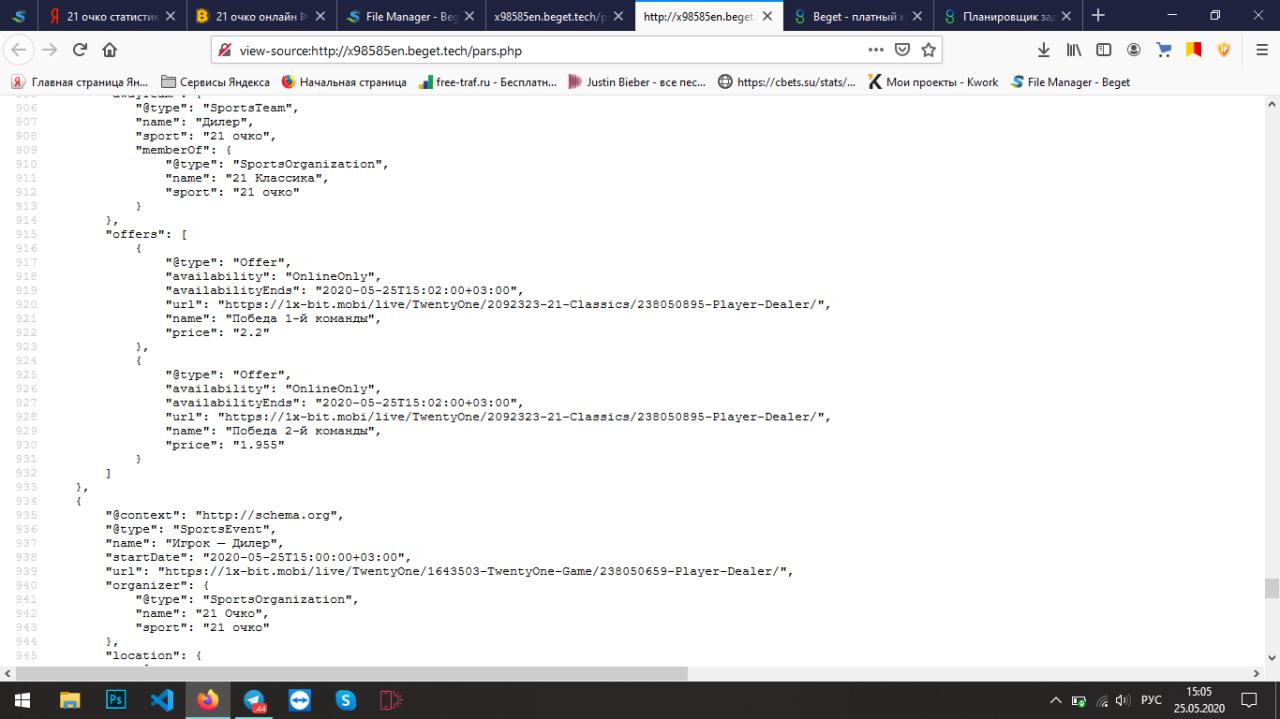 $text = file_get_contents( 'https://1x-bit.mobi/ru/live/TwentyOne/' ); preg_match( '/<script type="application/ld+json">(.*?)</script>/is' , $text , $ul ); $data = json_decode($ul[1]); foreach ($data as $v) { echo '<pre>'; print_r($v); echo '</pre>'; } $p = $v[offers][0][price]; echo $p; ________