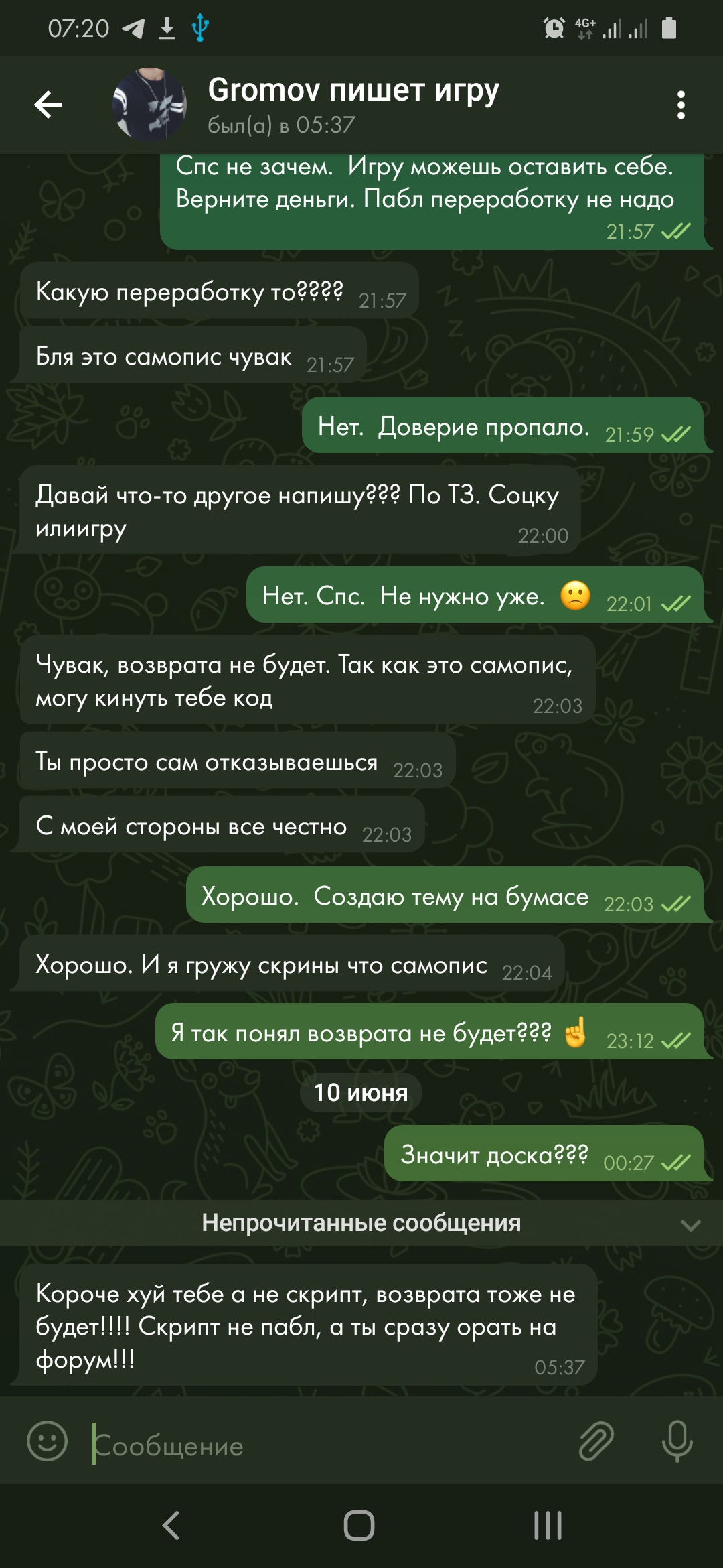 Договор был с нуля. А он взял с пабла двиг изменил пару строк кода и все. Я внёс пред оплату 950р.