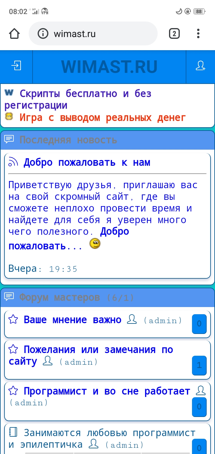 Приветствую мастера, приглашаю вас принять участие в тестировании вап сайта. Написан с нуля PDO, php-7.0+, ajax переход по страницам. Писался как вап мастерская, но сейчас немного хочу уйти в сторону от этого. Вообщем можете почитать темы на самом сайте и отписаться прямо там, что устраивает,а что нет или возможно что-то добавить нужно.