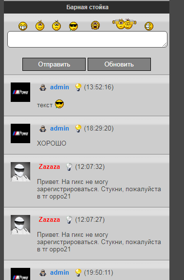 После того как я пишу в баре и отправляю смску в чате у меня вот такой вот результат (подробнее скрин №1)