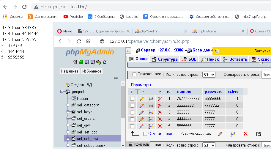 <?php mysql_connect("localhost", "root", "root") or     die("Ошибка соединения: " . mysql_error()); mysql_select_db("gproject"); $user['id'] = 77777; $result = mysql_query("SELECT * FROM `sel_set_qiwi` WHERE `password` = '".$user['id']."' AND `active` < 1 ");  while ($row = mysql_fetch_array($result, MYSQL_ASSOC)) {     printf ("ID: %s  Имя: %s </br>", $row["id"], $row["number"]);     $rows[] = $row; }  foreach ($rows as $row) {   echo $row['id'] . ' - ' . $row['number'] . "</br>"; }  mysql_free_result($result); ?>