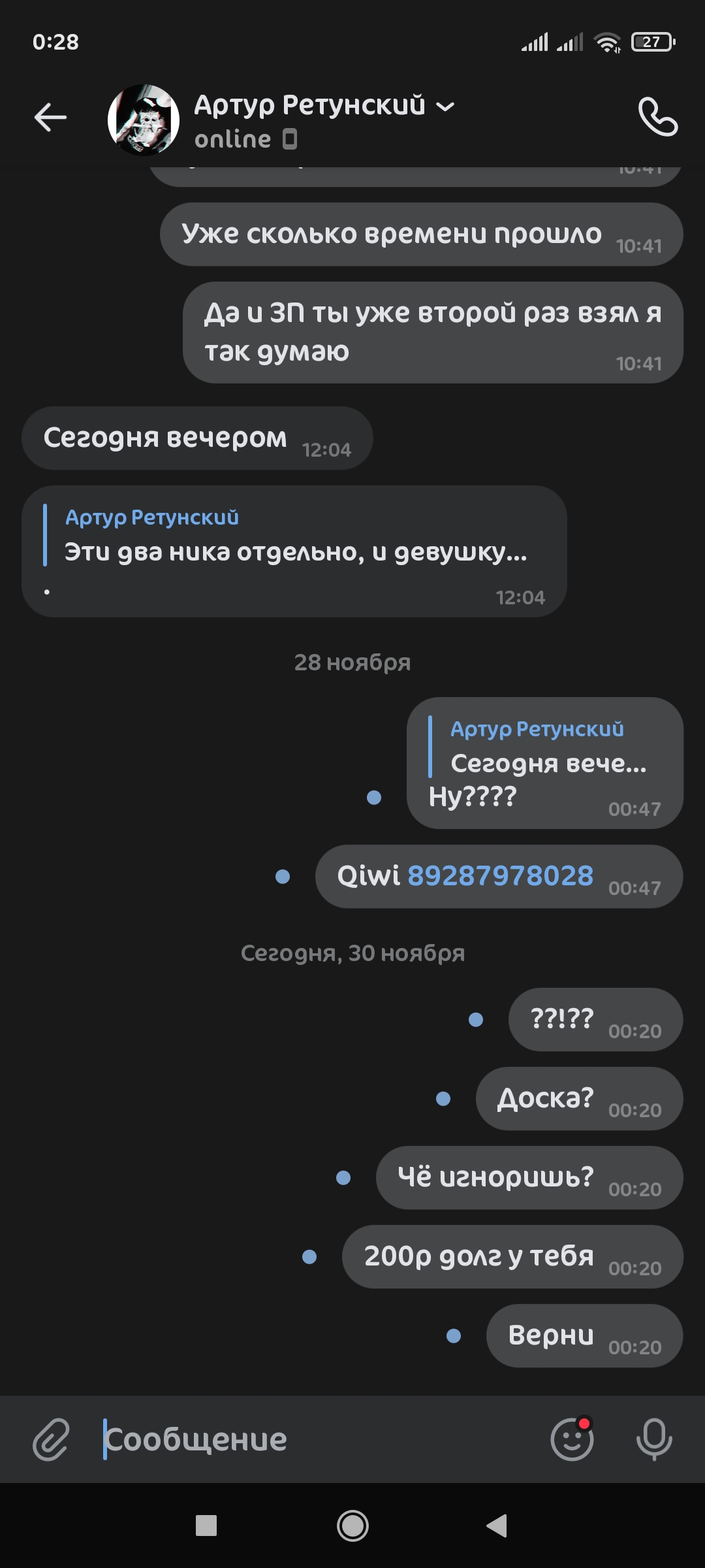 В трудную минуту я его поддержал и дал не много денег 30р - сказал что вернёт 200р, так вот сказал кто вернёт как получит ЗП в середине ноября. Ну время шло шло я ему писал говорил что вернёт по подожди чуть я вот ждал ждал и не дождался. Сегодня 30 ноября уже.