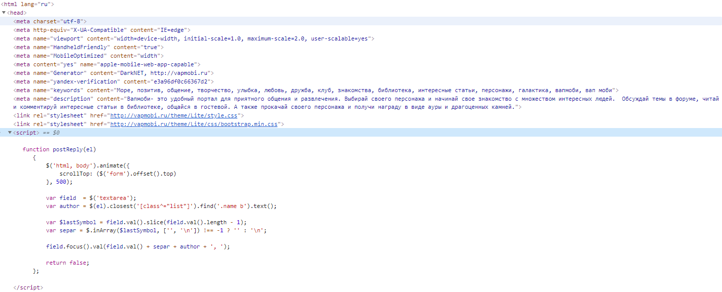 <head> <script> function postReply(el) { $('html, body').animate({ scrollTop: ($('form').offset().top) }, 800); var field = $('textarea'); var author = $(el).closest('[class^="list"]').find('.name b').text(); var $lastSymbol = field.val().slice(field.val().length - 1); var separ = $.inArray($lastSymbol, ['', '\n']) !== -1 ? '' : '\n'; field.focus().val(field.val() + separ + author + ', '); return false; }; </script> </head>