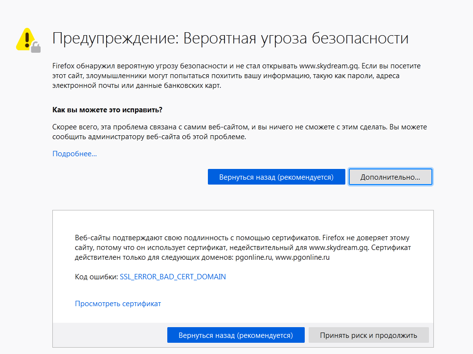 Создал новый домен c freenom.com в панели ispmanger на хосте pgonline.ru и такая байда как на скрине началась. Код ошибки SSL_ERROR_BAD_CERT_DOMAIN кто хочет загуглить.