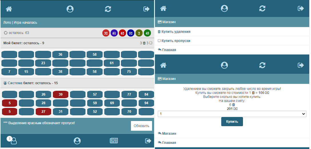 Добавил магазин, можно купить за виртуальную валюту удаление чисел если они еще не выпали, и открытие удаление числа если его пропустил