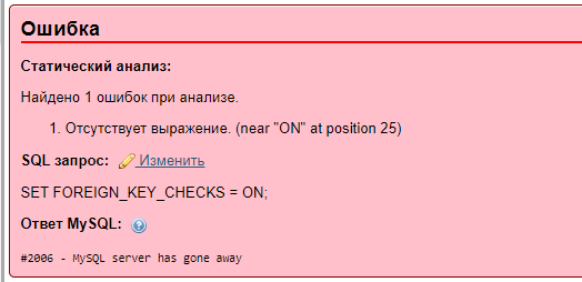 Уже нашёл выход, там синтаксис в бд исковеркан (записями наверно), попробовал залить отдельно проблемную таблицу - получилось