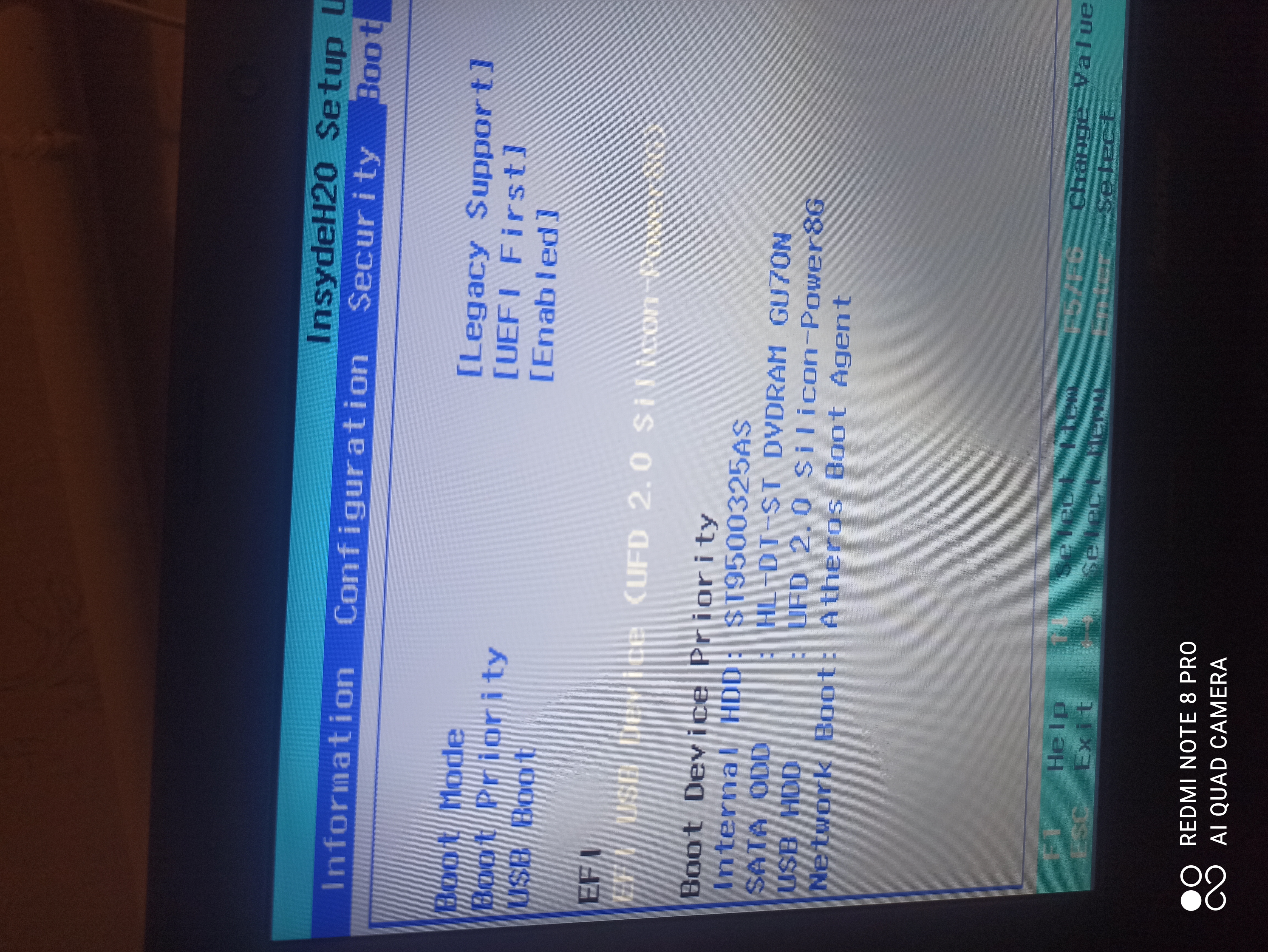 а вообще чтобы загрузиться в legacy, то тебе нужно при перезагрузке жать Fn + F12 и потом выбрать флешку БЕЗ надписи EFI