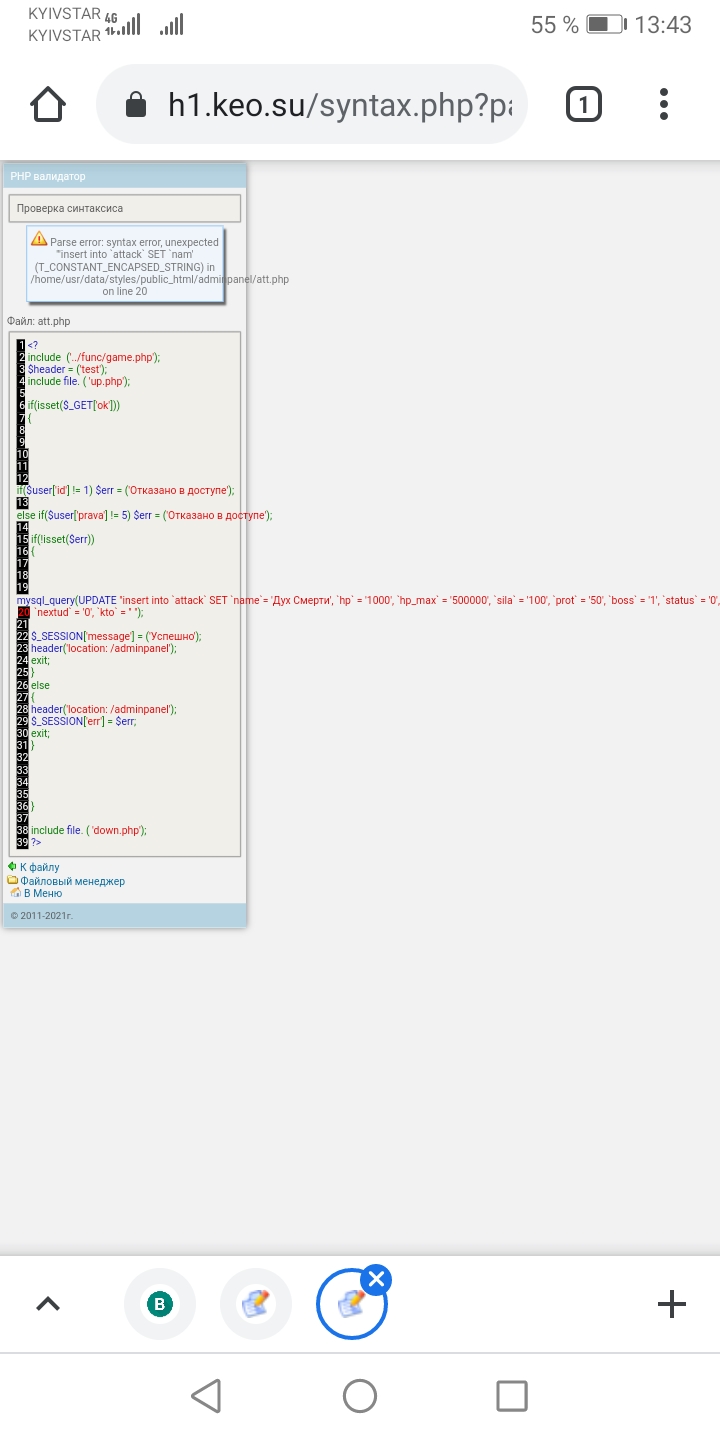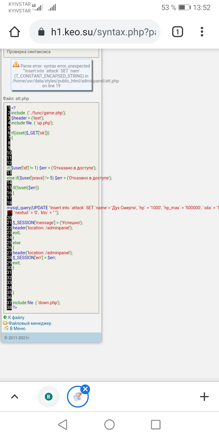mysql_query(UPDATE "insert into `attack` SET `name`= 'Дух Смерти', `hp` = '1000', `hp_max` = '500000', `sila` = '100', `prot` = '50', `boss` = '1', `status` = '0',