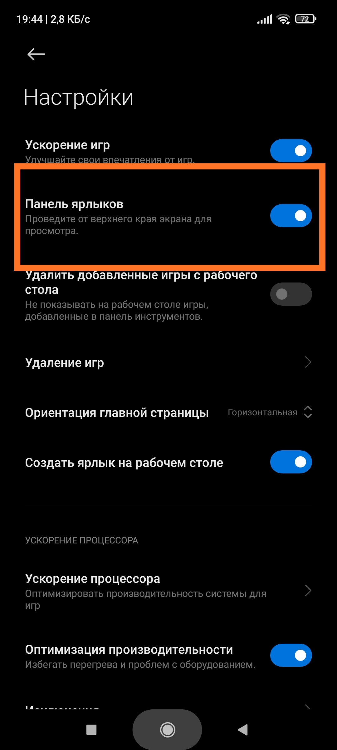 Перейдём к сути, панель ярлыков включена но если зайти в приложение или игру основные настройки работают но панель ярлыков нельзя включить, скриншоты снизу.
