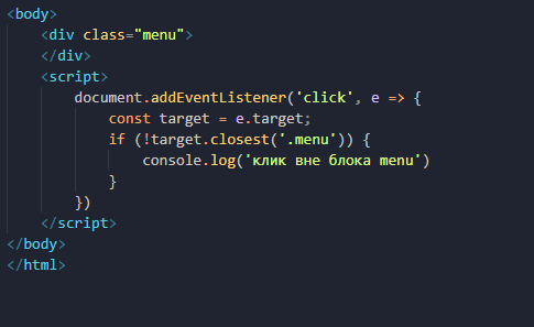document.addEventListener('click', e => { const target = e.target; if (!target.closest('.menu')) { document.querySelector('.menu').style.display = 'none'; console.log('клик вне блока menu') } }) ------