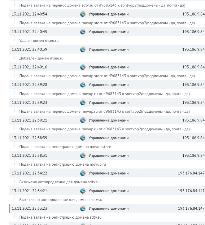 Ржавый , я кинул скрин с своей панели хостинга, это история действий, там четко видно что эти домены перенаправлены еа другой акк