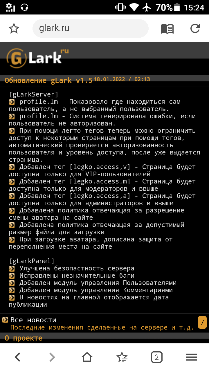 [+] При помощи легто-тегов теперь можно ограничить доступ к некоторым страницам при помощи тегов, автоматический проверяется авторизованность пользователя и уровень доступа, после уже выдается страница.